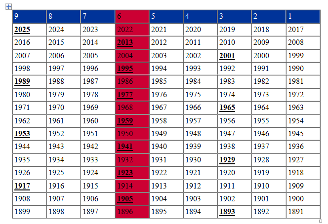 Строгая закономерность в событиях выявляется сразу. Если при анализе выделить (для еще большей наглядности) столбец под цифрой 6 каким-либо цветом, а годы 1893, 1917, 1929, 1953, 1965, 1989, 2001 и 2025 соединить (в указанной последовательности) ломаной линией, то таблица просто впечатляет.