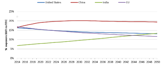 доля США будет постепенно уменьшаться примерно с 17% в настоящее время до примерно 14% к 2050 году, тогда как доля Индии может удвоиться с нынешних 7%, и к середине века ВВП Индии почти сравняется с ВВП США, рассчитанным по ППС;