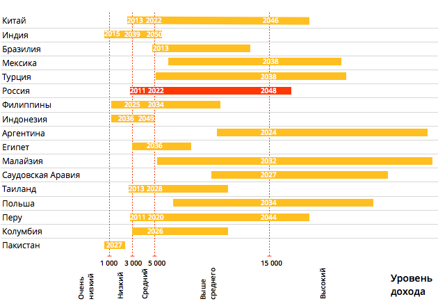 • К середине века Россия может быть отнесена к странам с высоким уровнем дохода, но при этом отстанет по этому показателю не только от Аргентины, Турции и Мексики, но и от Китая.