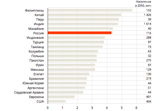 • В Филиппинах, где в 2050 году народу будет в два раза больше, чем в Германии или Великобритании, можно будет увидеть увеличение реальных доходов населения в 9 раз.