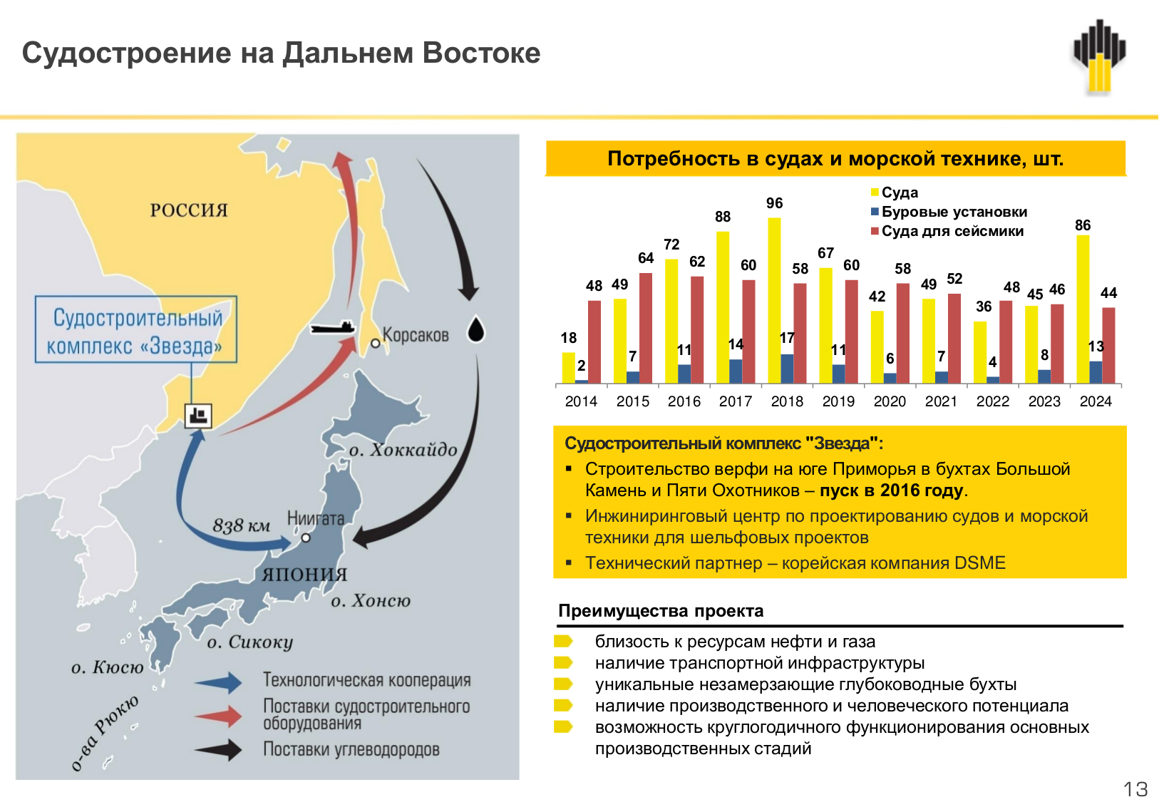 Проекты Компании на шельфе Российской Федерации требуют своевременного обеспечения современной арктической морской техникой и нефтегазовыми платформами. Только в Карском море нам потребуется более чем 500 единиц уникальной морской техники. Не меньшим спрос будет и на шельфе Дальнего Востока. Под эти задачи сегодня мы создаем новый судостроительный кластер в районе Владивостока.