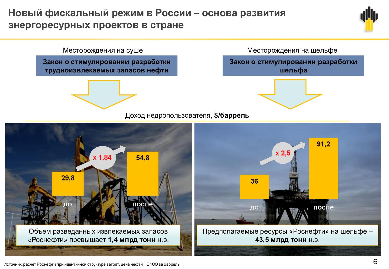 Российское правительство создало новый режим фискального стимулирования разведки и добычи углеводородов на Российском шельфе, что позволит увеличить почти в 2,5 раза эффективность проектов при разработке новых месторождений на шельфе. То, что сейчас сделано в плане налогового регулирования в России, существенно опережает возможности, предоставляемые другими странами.