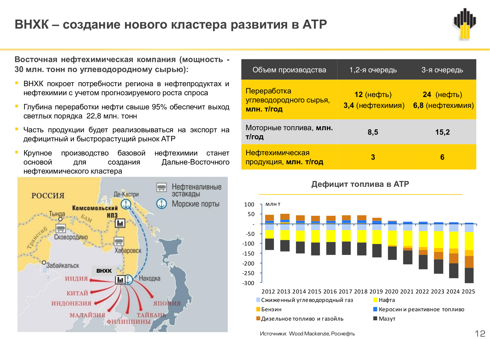Потенциальная мощность ВНХК по сырью до 24 млн. тонн в части нефтепереработки и до 6,8 млн. тонн по нефтехимии. Глубина переработки нефти свыше 95% обеспечит выход светлых в 22,8 млн. т. Планируются поставки продукции ВНХК на динамично развивающиеся рынки АТР. Общая стоимость проекта — порядка 40 млрд. $. Мы приглашаем наших японских партнеров принять участие в реализации этого амбициозного проекта. Хочу обратить ваше внимание, что в рамках этого проекта Правительство РФ, фактически, субсидирует инвесторов, за счет инфраструктуры и таможенных пошлин.