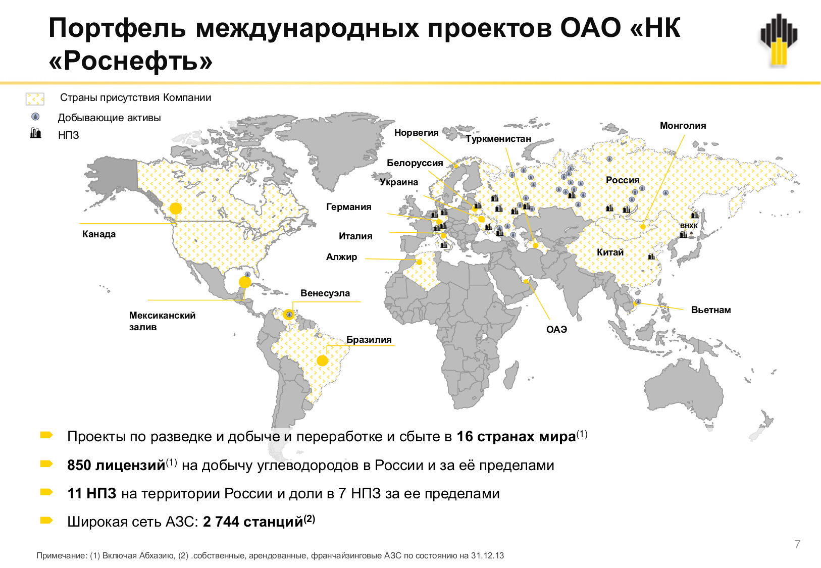 Сегодня Компания реализует проекты в секторах апстрим и даунстрим в 16 странах. Портфель международных проектов "Роснефти" продолжает расширяться. Умение эффективно работать в любых географических и экономических условиях является важной составляющей компетенций глобальной энергетической корпорации и позволяет ей гибко подстраиваться к условиям рынка, к изменениям спроса.