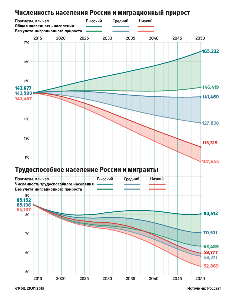 В моих словах нет никаких оценок, хорошо это или плохо. Огромный приток трудовых мигрантов – объективная реальность, с которой России предстоит столкнуться. Альтернатива тоже хорошо понятна: смириться с тем, что потенциальные трудовые ресурсы в российской экономике в течение прогнозного периода сократятся примерно на треть (среднее между низким и средним сценарием). Это неизбежно будет означать существенный вычет из темпов экономического роста и еще большее упрощение экономики.