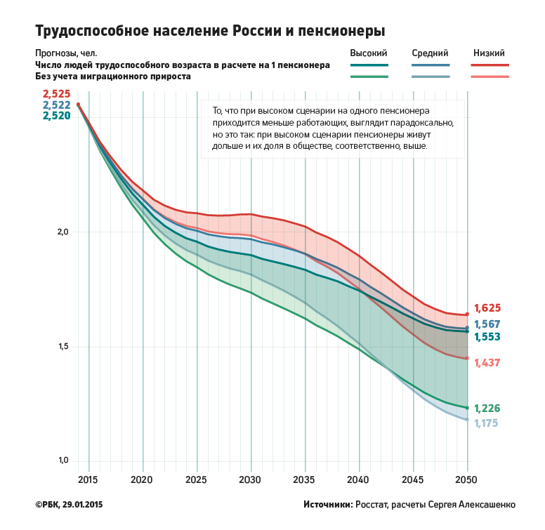 Стоит оговориться, что само по себе значение этого соотношения (2,6 или 1,8, например) не стоит считать абсолютно корректным. В численность населения России – и трудоспособного, и за пределами трудового возраста – включаются иностранные граждане. Сколько их включил Росстат в своих расчетах на начальной точке прогноза (начало 2014 года), мне неизвестно. Однако сравнение данных Росстата и ФМС показывает значительное (почти в два раза) расхождение в оценках числа иностранцев, находящихся в России.