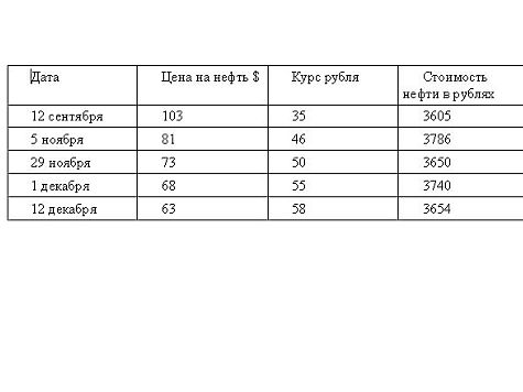 Есть вещи, которые, по идее, тонуть не должны. К примеру — дерево. Отчего же тонет «деревянный»? И кто его топит: рынок или иные механизмы? Обратите внимание: курс рубля падает настолько синхронно с ценами на нефть, что рублевая цена «бочки» абсолютно не меняется. 12 сентября доллар стоил 35 рублей, а баррель $103 — то есть около 3600 рублей, 12 декабря «вечно зеленый» поднялся до 58 руб., а «бочка» стоила $63, то есть все те же 3600 рублей.