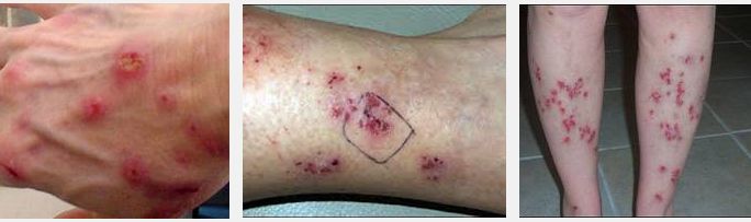 Первый случай проявления болезни был зафиксирован в Америке и характеризовался образованием пузырьков крови на пальцах и ступнях, которые скапливались под кожей.