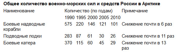 В таблице представлены экспертные данные по общему количественному составу военно-морских сил и средств, теоретически имевших возможность защищать национальные интересы России в Арктике в последнее десятилетие прошлого века и в начале нынешнего. Из приведенных данных следует: