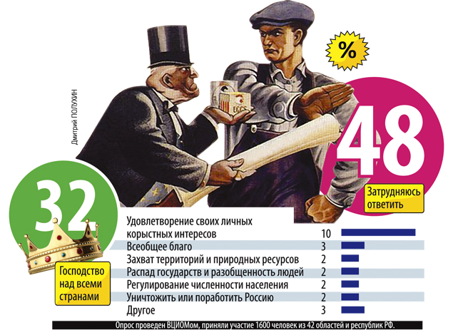 Правда, мнения о составе этого «правительства» в России разнятся. Одни считают, что планетой рулят олигархи, другие грешат на американцев, третьи – на масонов, евреев, «некоторых мировых политиков», либо конкретных Обаму, Джорджа Буша и королеву Великобритании Елизавету II. Сумятица в ответах понятна - правительство ведь тайное! Не верит в него треть опрошенных россиян, четверть - затруднились с ответом.