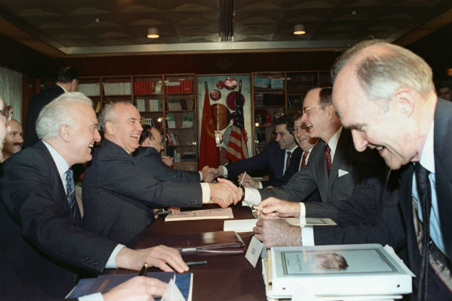 Та самая встреча на Мальте. На фото: слева - министр иностранных дел СССР Эдуард Шеварднадзе, второй слева - генсек ЦК КПСС Михаил Горбачев, второй справа - президент США Джордж Буш.