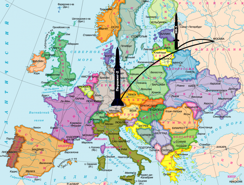 И всё было бы хорошо, если бы не стало ещё хуже. Дистанции до Москвы ещё больше сократились — подлётное время ракет SM-3 мобильной системы ПРО ещё меньше, чем у "перехватчиков" GBI. "Противоракета" SM-3 — это мини-«Першинг-2» у самых границ России. Если ракета «Першинг-2» из Западной Германии должна была пролететь почти 1.800 км, то расстояние от Москвы до Чёрного моря чуть более 1.000 км. Балтийское море ещё ближе — 700-800 км. До стран Прибалтики — менее 600 км — в 3 раза меньше, чем до Западной Германии.