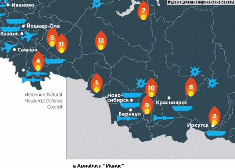 Уже сейчас при размещении на базе «Манас» (Бишкек) "противоракетам" SM-3 Block IB доступны: Магнитогорск (цель 4 — 1.639 км), Пермь (цель 5 — 2.111 км), Екатеринбург (цель 11 — 1.841 км), Омск (цель 1 — 1.348 км), Уренгой (цель 7 — 2.578 км), Ханты-Мансийск (цель 12 — 2.050 км), Новокузнецк (цель 9 — 1.518 км), Анджеро-Судженск (цель 10 — 1.679 км), Братск (цель 8 — 2.418 км), Иркутск (цель 2 — 2.440 км).