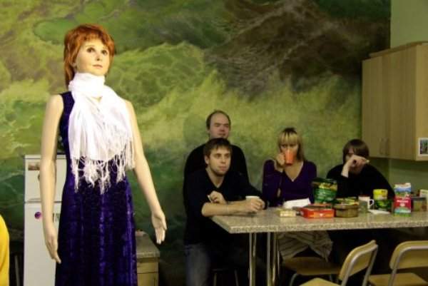 Стоит отметить, что голова андроида установлена на корпусе обычного манекена, а тот в свою очередь прикреплен к тележке с колесами, что позволяет роботу передвигаться. Внутри тележки можно обнаружить батареи для снабжения робота энергией.