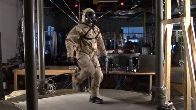 Робот, похожий на человека, одетого в камуфляжный костюм, может подниматься по ступенькам, отжиматься, бегать и делать множество других движений на поле боя.