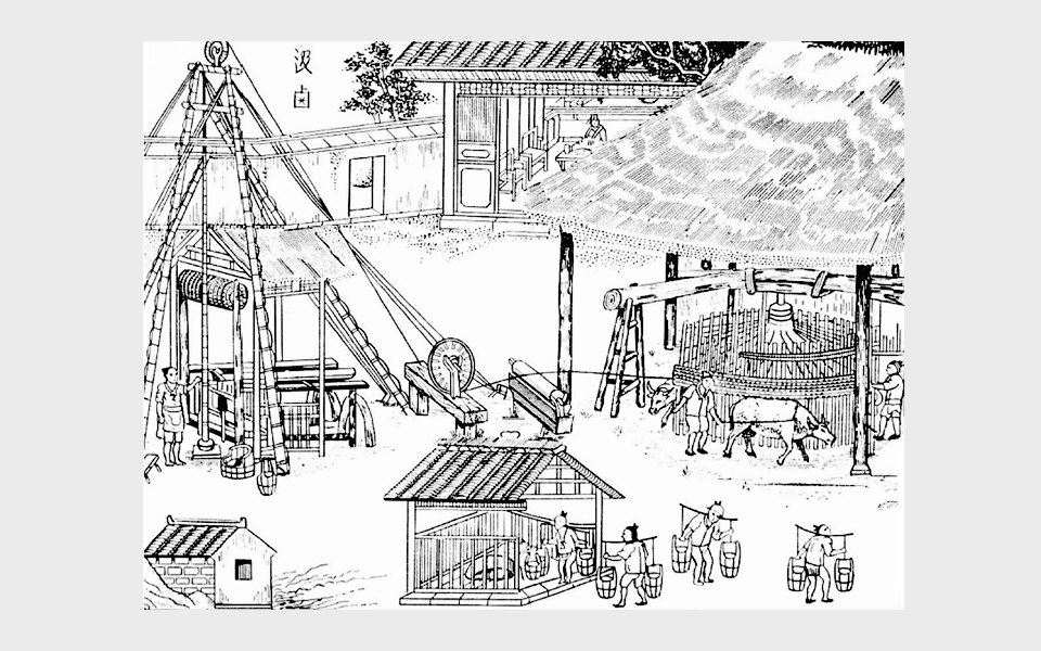 СОЛЬ БЫЛА ВАЖНЕЙШИМ РЕСУРСОМ В ДРЕВНИЕ ВРЕМЕНА — с её помощью хранили пищу задолго до изобретения заморозки. В основном соль добывалась в море, но соленая вода есть далеко не везде, где живут люди. В китайской провинции Сычуань около 2000 лет назад соль научились доставать в прямом смысле из-под земли — при помощи продвинутой технологии бурения. Древние китайцы использовали бамбуковый бур с тяжёлым барабаном (он весил около 140 килограмм), который ритмично бил в почву и в итоге мог проникнуть на глубину до 600 метров. Иногда в процессе бурения из земли вырывался природный газ (в основном метан); в конце концов, китайцы научились таким образом добывать и его и тоже использовать. В Китае существовал сложный газопровод из бамбуковых труб, который растягивался на многие километры. В основном газ сжигался и использовался в качестве источника огня и тепла.