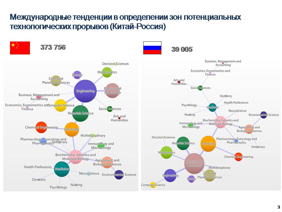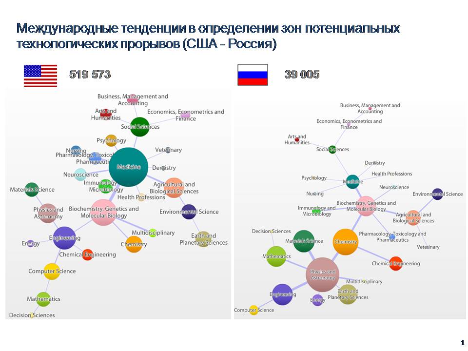 Евгений Кузнецов: Сейчас вы это увидите, я к этому подвожу. Еще раз посмотрим на Германию. Мы видим, что в ней медицина зелененькая, через биохимию, генетику, молекулярную биологию идет в химию. Молекулы, пилюли, химия. Дальше это идет в физику. Еще раз, что значит «идет». Это количество связей между статьями, то есть статьи на смежные тематики, авторы смежных областей и так далее. То есть взаимный переход, одна в другую. Это классическая карта науки на начало 2000 годов, даже на первое десятилетие 21-го века. Медицина, биология, биохимия, химия, физика. А теперь ещё раз внимательно смотрим на США. Из биохимии сразу в инжениринг, и только потом компьютер сайенс, физика, химия и так далее. Этот переход случился в 2010 году. Если вы построите предыдущий график, на нем точно так же биология и биохимия идут в химию и физику. Этот переход свершился на наших глазах, поменялась карта науки. Что это означает? Что там начался научный прорыв или технологическая революция. На наших глазах это меняется. В данный момент основное количество фондов в США считает для себя приоритетом вкладываться в Digital health, то есть IT проекты в области биологии и медицины. Этот прорыв недавно обсуждали, один из грамотных людей подсказал, что, скорее всего, это последствия расшифровки генома человека, потому что геном человека – это IT–проект, и из него вытекает набор инженерных решений. И этот макропрорыв отобразился в этом. А сейчас, когда отработают два мегапроекта, европейский и американский, по карте мозга, то мы здесь получим ещё больший сдвиг, потому что мы напрямую от медицины от компьютер сайенс в инжиниринг получим шифт. И там тогда вообще все передвинется. Вот этот инструмент, условно говоря, как отслеживать смену тренда. Этот инструмент обладает чрезвычайно высокой инерционностью. Мы это увидели в 2011 году, а процесс отображает 2005 год. Для этого существуют другие способы, можно анализировать не за 5 минут, это делается за секунды. Ну а другими, более тонкими методами, например, смотреть не по всем журналам, а только по высокоимпактным, не по всем авторам, а по тем, кто известен своей динамичностью. Смотреть на то, где происходят самые неожиданные заявления, и кто на них откликается. Вот там кто-то сказал, что будет прорыв здесь, а его почему-то послушали, туда пошли деньги, почему-то образовался конгломерат, консенсус других центров, согласны с этим. Методы тонкие, но они существуют, и они все целиком и полностью относятся к анализу данных, они не относятся к анализу личных симпатий или убеждений, которые вызрели ещё в университетское время.