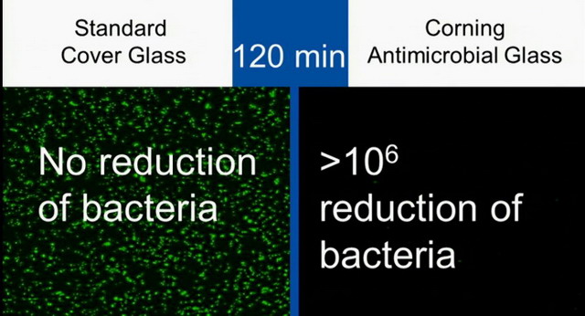 Старший вице-президент Corning Джефф Евенсон также сообщил на презентации, что компания в настоящее время работает над стеклом, которое способно убивать паразитов и вирусы — даже устойчивые к антибиотикам разновидности. Он продемонстрировал, как стекло убивает микробов, с помощью слайдов, на которых микробы показаны в виде ярких зелёных точек. После двух часов антимикробное стекло имело на себе в миллион раз меньше бактерий, чем стекло обычных телефонов.