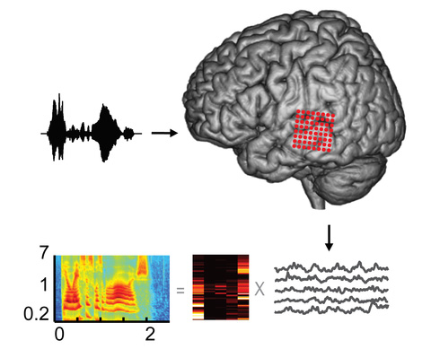 Схема эксперимента. Электроды на поверхности коры (красные точки справа) записывают сигнал от нейронов в то время, когда человек слушает речь в динамиках (образец слева). Изменение потенциала во времени (внизу справа) накладывается на модель реконструкции звука (внизу в центре).