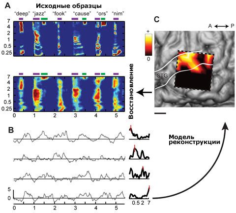 А) Шесть слов для примера. Вверху — исходные спектрограммы, внизу – реконструированные. Шкалы: килогерцы по вертикали, секунды по горизонтали. B) Отклик нейронов на один из звуковых образцов. C) Распределение веса сигналов от разных групп клеток (цветная шкала) в модели реконструкции звука. Пунктирный прямоугольник – область с задействованными в опыте электродами. Масштабная линейка – 1 см (иллюстрация Brian N. Pasley et al./ PLoS Biology).