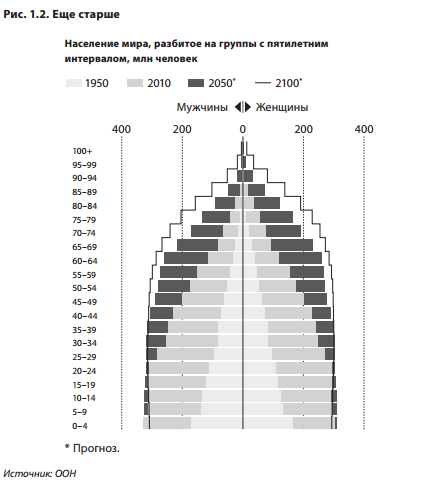 до более чем 16% в 2050 г. Так называемый медианный возраст (средний возраст, при котором половина населения старше его, а половина моложе) в период с 2010 по 2050 г. увеличится на девять лет и составит 38 лет — беспрецедентный показатель, как и скорость его достижения. В развитых странах многие смогут дожить до 100 лет.
