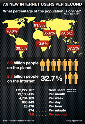 Сопутствовать вышеперечисленным процессам будет все более глубокое распространение Интернета по всему миру. Согласно прогнозам, к 2017 г. доступ в сеть будет иметь половина населения Земли (3,5 млрд человек). К 2020 г., как считают авторы упомянутого отчета ОБСЕ, эта цифра вырастет до 5 млрд человек. Спустя еще десятилетие уровень проникновения Интернета в развитых странах вплотную приблизится к 100%. Это означает, что использование глобальной сети станет нормой для всех социальных и возрастных групп, включая детей, пенсионеров и малоимущих.