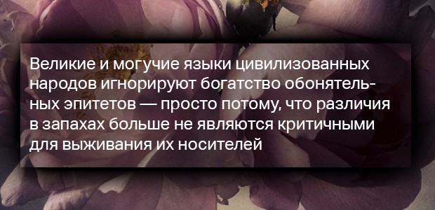 Когда люди — по крайней мере англоговорящие — характеризуют запах, они в первую очередь называют его источник: апельсиновый, дымный и т. д. Это вполне естественно, но другие сенсорные впечатления мы описываем принципиально иначе. Слова типа «белый» и «круглый» называют визуальные свойства объекта, но не объект как таковой: такими свойствами может обладать как мячик для гольфа, так и луна. Точно так же звук может быть «пронзительным», вне зависимости от того, издает его птица или кипящий чайник.