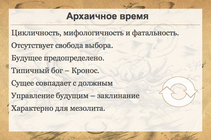 Единственное управление будущим, которое там было возможно, это заклинание. Этот мир был магический. Следы заклинаний мы видим в наскальной живописи в пещерах, когда для хорошей охоты рисовалось животное, пораженное копьем, – это заклинание, овеществленное в картинке. Из истории антропологии племен, находящихся в архаичных стадиях развития, мы знаем, что заклинания были и вербальные, развитая система табу. В общем, все это было характерно для мезолита. Местами, какими-то каплями, оно сохранилось и в настоящее время, причем иногда в очень превращенных формах. Например, в экономике очень часты заклинания, хотя они давно не действуют. То есть нужно понимать, что вот эта вот архаика местами прорастает в наше настоящее.