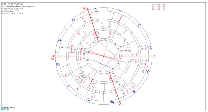 В карте российского суверенитета в 2017 году проявлено несколько довольно жестких аспектов в прогрессиях и дирекциях. В частности, Урана (символика перемен и революций) и Марса (уже без комментариев) с Луной карты. Луна в карте государства символизирует народ, нацию, территории, национальный вопрос…
