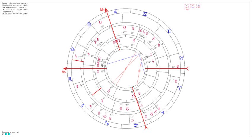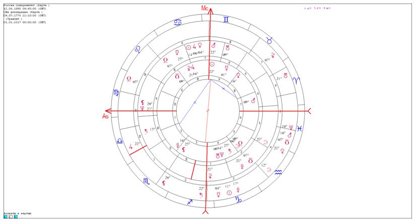 В другой важной карте России — карте суверенитета (12.06.1990) — Солнце находится в 22-м градусе Близнецов, то есть точном соединении с Марсом карты США и оппозиции с Марсом в карте российской власти. Таким образом, здесь и внутренний, и внешний потенциальный конфликт активизируется в 2017 году Сатурном, в чьи функции входит, в частности, максимально проявлять проблемы и требовать их решения.