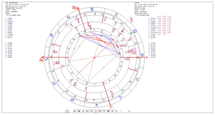 Тогда, в 1946 году, когда родился нынешний американский лидер, именно так и было. Это было время, когда после окончания второй мировой войны отношения между бывшими союзниками - СССР и США - стали резко ухудшаться, и именно 1946 год считается годом начала холодной войны. Формальным моментом и сигналом ее начала считается речь Черчилля в американском Фултоне 05.03.1946 г. Через год, 12.03.1947 г., была провозглашена доктрина Трумэна, окончательно утвердившая позиции противостояния Запада и Востока. И вот сейчас новый лидер США приносит это далекое затмение в новую политическую реальность, контуры которой пока только начинают прорисовываться. Его карта становится важной политической картой страны и начинает «работать» совместно с национальной картой, опять «включая» Марс карты государства.