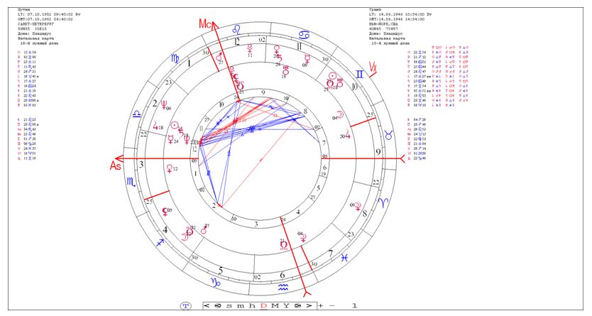 То есть, опять конфликтные энергии. Правда, есть во взаимодействии этих карт и другие факторы, которые можно считать позитивными. Можно сказать, что, судя по картам, в характерах этих лидеров может быть много схожего, и им может быть легче понять друг друга и относиться друг к другу с симпатией. В случае совпадения интересов и выгод, их совместные действия, вероятно, могут быть очень продуктивными. Особенно, если речь пойдет об уничтожении общих врагов (Марсы в их картах в конструктивных аспектах друг к другу). Но в случае конкуренции и противостояния, конфликт между ними может быть очень серьезным, жестким, и даже разрушительным. В 2017 году именно наиболее конфликтную для взаимоотношений область карт обоих лидеров активизирует Сатурн. И происходить это будет на фоне очень непростых отношений между США и Россией, сложившихся за последние годы.