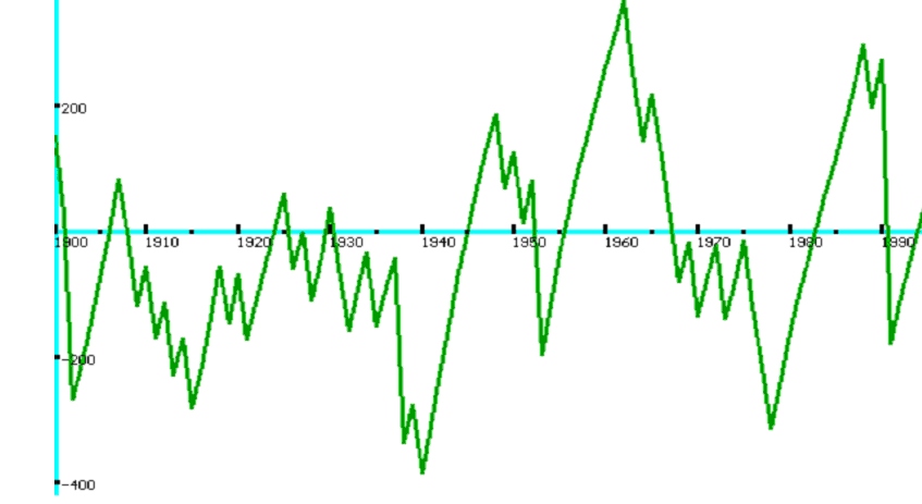 Некоторые выводы. Кривая на рис. 1 часто опускалась ниже горизонтальной оси, что описывает ХХ век как очень напряжённый, кровавый и драматичный. Хотя это мы и так уже знаем. Беглый взгляд на рис. 2 позволяет говорить, что за исключением второго и начала третьего десятилетия ХХI век гораздо менее напряженный. «Жаль, только жить в это время прекрасное уж не придется ни мне, ни тебе", как говорил Николай Некрасов. Ну что ж, в таком случае будем спокойны хотя бы за наших детей.
