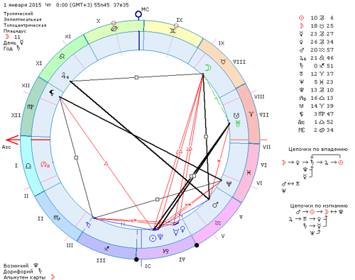Приближается новый, 2015 год, пора делать астрологический прогноз. Этот астрологический прогноз касается прежде всего России и сделан на основе гороскопа момента наступления нового, 2015 года (0 часов, 00 минут 1 января) в Москве. Опять же повторюсь, особенность Гражданского Нового Года такова, что разница в гороскопах Нового Года, построенных для разных местностей будет очень незначительной. И, опять же, Россия выпадает из общего правила потому что на территории России действует так называемое Декретное ("зимнее") время, опережающее поясное на 1 час. Это смещает положение домов по сравнению с остальными странами (в данном случае – существенно) и, соответственно6 влияет на те тенденции, которые будут реализовываться в течение года. Тут надо сказать, что по сравнению с действовавшим до недавнего времени "летним" временем это влияние больше позитивное.