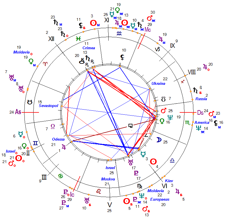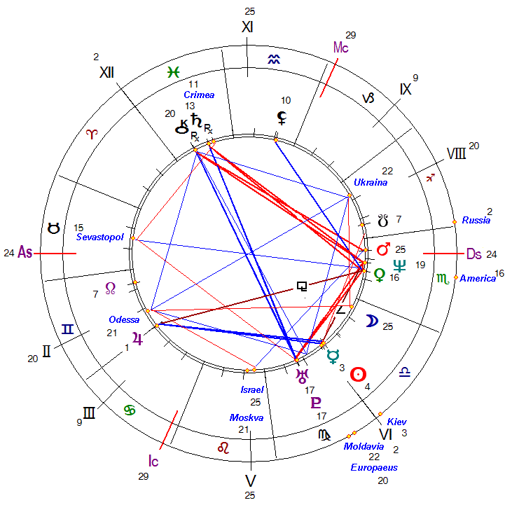 Венера (любовь, оценка ситуаций, сладости) в 6 Доме образует соединение с астероидом America (Америка) и Нептуном (тайны, секреты, интуиция, махинации, обман) в 15°39 и 18°08 Скорпиона, секстиль с Ураном (неожиданности, новации, изобретательность, восстания, бунты) и Плутоном (рок, глубинная психология, управление массами, олигархи, мафия, спецслужбы), а через Нептун и с астероидами Europaeus (Европейский союз) и Moldavia (Молдавия) в 16°23, 16°44, 19°46 и 21°45 рациональной Девы в 5 Доме любви, детей, творчества, искусства, спекуляций, выборов, трин с астероидом Crimea (Крым), Сатурном (ограничения, препятствия, терпение, концентрация, дисциплина, честность, строгий отец) и Хироном (странности, двойственности, наставник) в 10°49, 12°20 и 19°37 размытых Рыб в 11 Доме надежд, друзей по идеалам и старших братьев, оппозиция с астероидом Sevastopol (Севастополь) в 14°53 Тельца в 12 Доме тайн, изоляции и секретов.