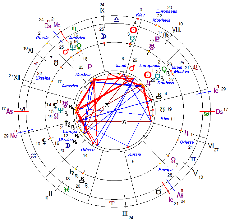 В этой карте выделяется скопление планет Порошенко в 8 Доме чужих денег, банков и политики Украины, а также вблизи ее МС (цели, власть). В 8 Доме находятся Уран (неожиданности, новации, изобретательность, восстания, бунты) и Плутон (рок, глубинная психология, управление массами, олигархи, мафия, спецслужбы), астероиды Europaeus (Европейский союз) и Moldavia (Молдавия) в 16°23, 16°44, 19°46 и 21°45 расчетливо-дотошно-бухгалтерской Девы, а также Меркурий (замыслы, решения, связи, коммуникация, контакты), астероид Kiev (Киев) и Солнце (воля, инициативы, власть) в 2°43, 2°47 и 3°25 Весов.