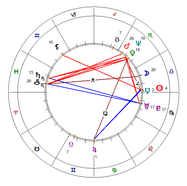 На ней Венера, отвечающая за кондитерские изделия, сладости, сахар, почки, поджелудочную железу и сахарный диабет, находится в 15° Скорпиона и образует полутораквадрат с Юпитером (широта, полнота, печень, артериальная система кровообращения) в 1° Рака. Венера в Скорпионе находится в заточении и потому слаба, а Юпитер в Раке экзальтирует и силен. Кроме того, он образует квадрат с Меркурием (мышление, речь, нервная система) и Солнцем (воля, инициативы, власть, сердце, сердечнососудистая система) в 3° 4° Весов.