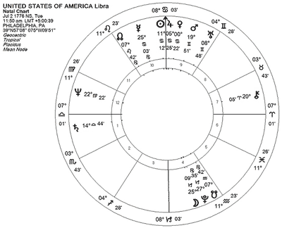 Теперь я предпочитаю использовать для астрологического анализа Соединённых Штатов время рождения 2 июля 1776, 11:50, с восходящим знаком Весов, как показано на приведенной здесь карте*.