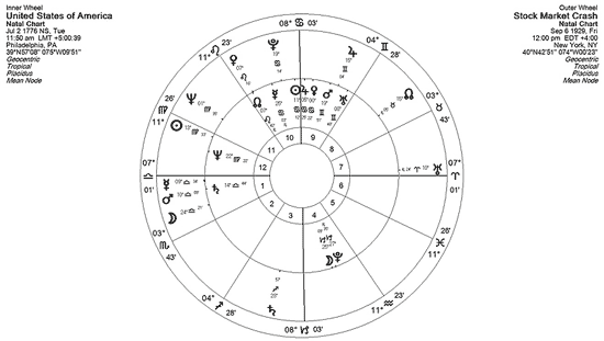 Если взглянуть на карту сентября 1929 года, то можно заметить, что Уран формировал точный аспект к Солнцу-Сатурну США в 1929-1931 годах. Именно в это время произошёл обвал рынка акций. Сейчас Уран снова в этом аспекте. Плутон в режиме "инкубации": события последуют позже. Уран же действует молниеносно, события происходят внезапно и развиваются гораздо стремительнее, чем кто-либо может уследить. В данный момент над США нависли обе эти тяжёлые сигнатуры, исподволь воздействуя на их исполнительные и законодательные инициативы. Самая суть правительства сейчас под ударом небес. И, согласно принципу "как наверху, так и внизу", опасность стране грозит как изнутри, так и снаружи.