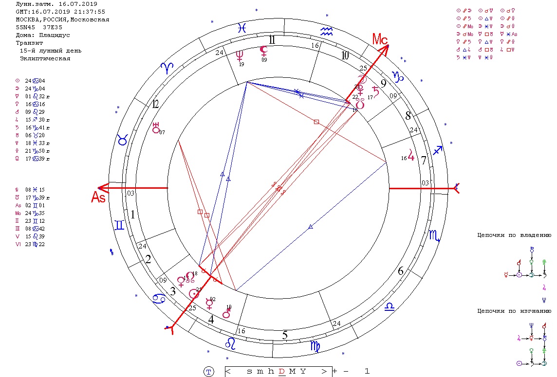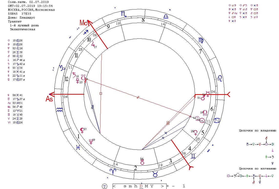 Следующее зона потенциально повышенного напряжения года связана с затмениями июля. 02.07.2019 Солнечное затмение и 17.07.2019 Лунное затмение. Затмения на все той же оси Козерог-Рак, дополняют, усиливают и «включают» основной аспект года - соединение Сатурна с Плутоном. Оба затмения жестко проектируются на Россию. В карте Солнечного затмения, построенной на Москву, Марс в соединении с Меркурием на Десценденте и в квадрате к Урану. Это говорит о повышенной вероятности конфликтных, скандальных, аварийных ситуаций серьезного, возможно международного масштаба. Уран во 2 доме – намек на возможность каких-то проблем в финансовой сфере.