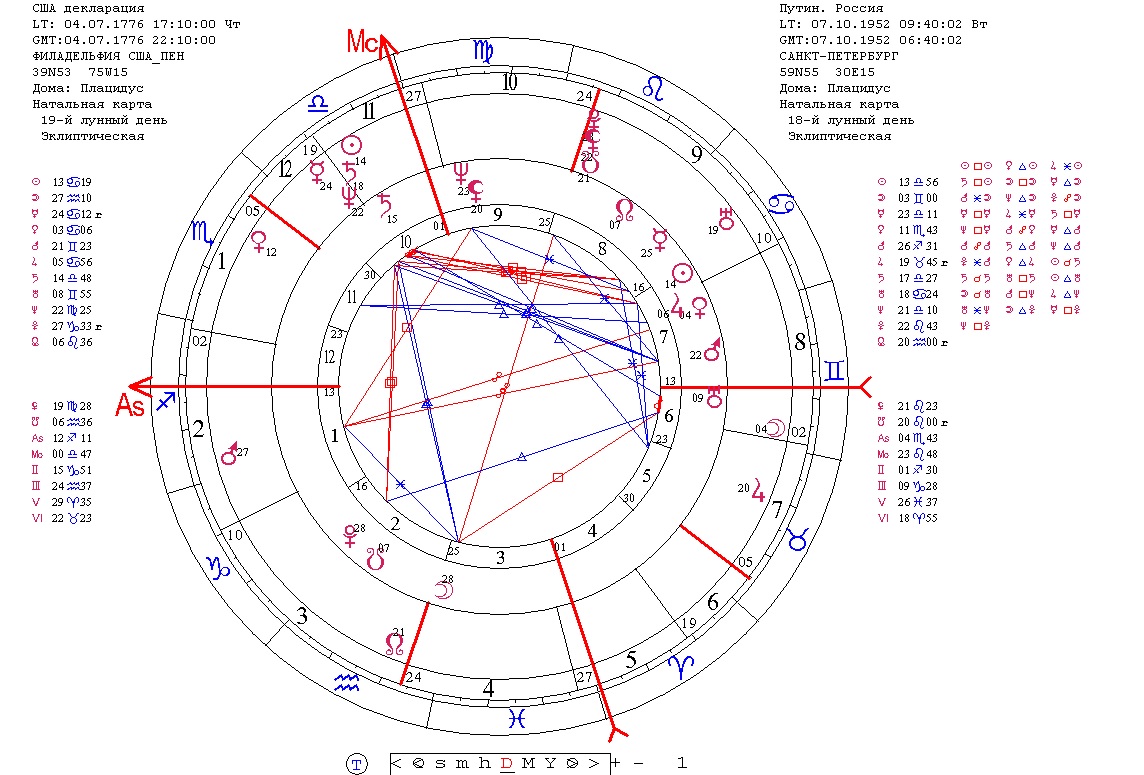 Что касается отношений Россия - США, то здесь важнейший и чреватый непростыми временами и осложнениями аспект года - это квадратура и оппозиция Сатурна к Солнцу и к Сатурну обоих карт, которые одновременно включают один из самых напряженных аспектов во взаимодействии карт, а стало быть - во взаимоотношениях стран. Пик влияния – август-октябрь.