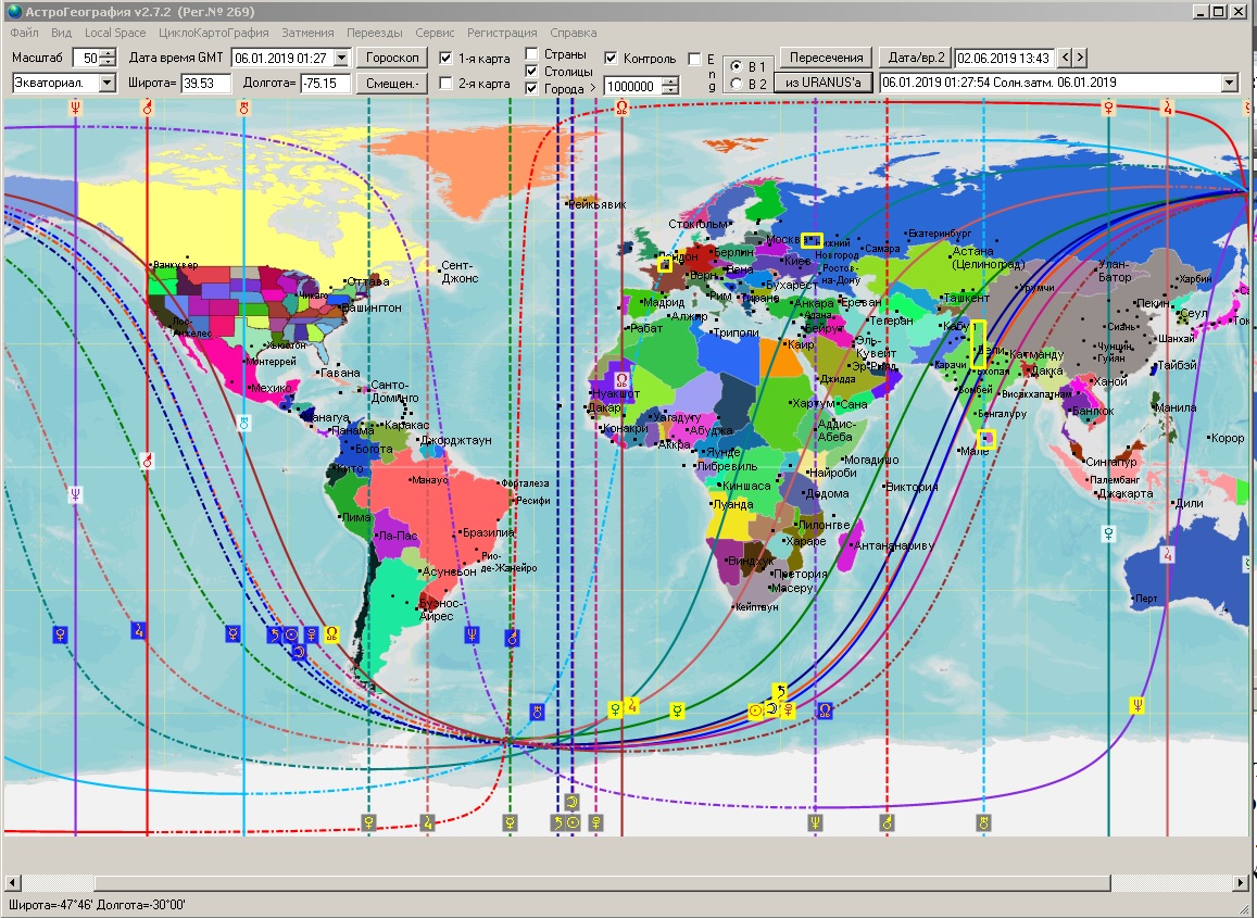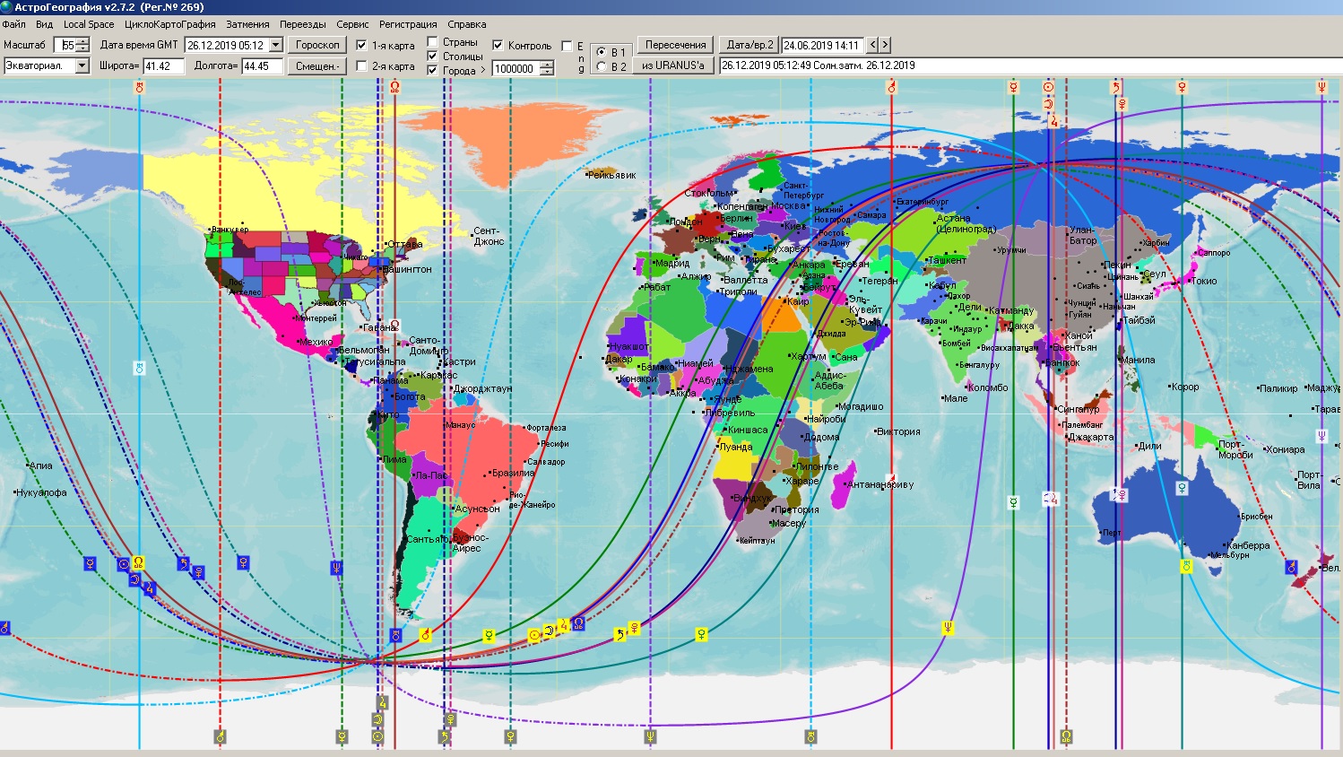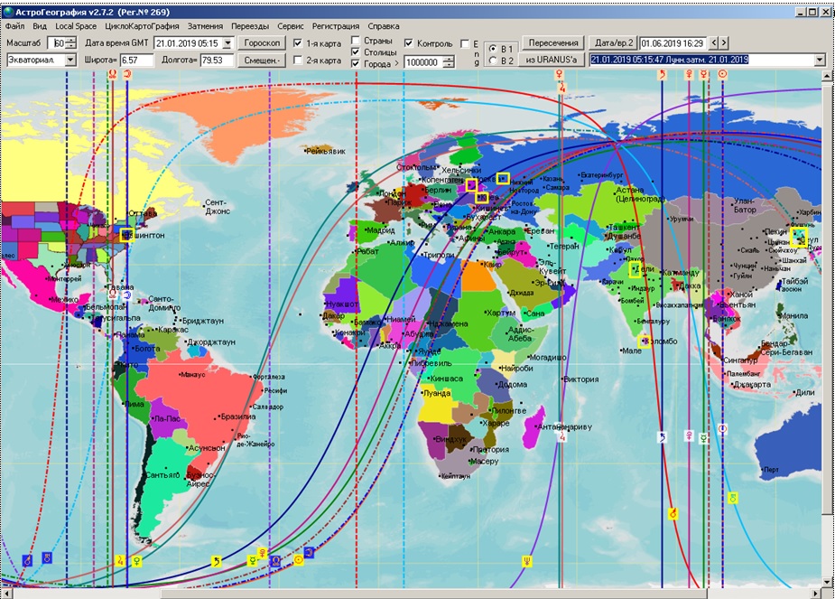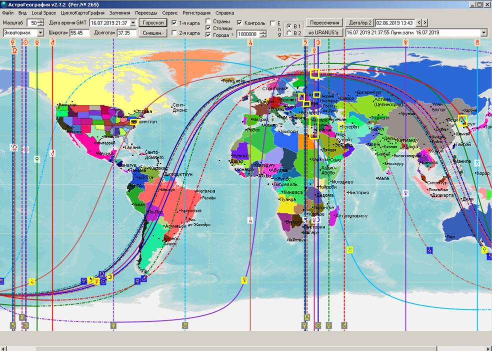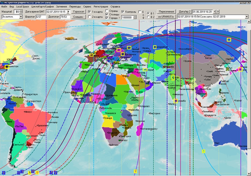 * В приложении в конце статьи приведены АКГ карты затмений 2019, на которых видно, как планетарные энергии затмений проектируются на карту мира, распределены по регионам Земли. Поскольку действие затмений не менее +- полгода, на картах желтыми прямоугольниками обозначены точки на карте, где в 2019 году уже произошли заметные серьезные события.