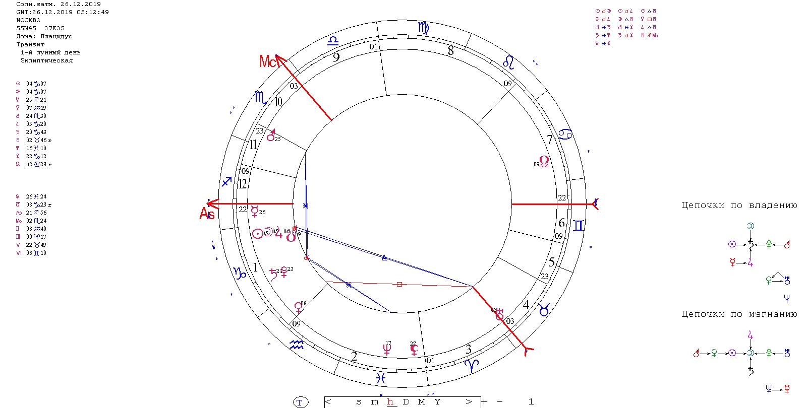 А вот карта последнего затмения 2019-го года - солнечного затмения 26.12.2019, построенная на Москву. Это затмение серьезно догружает знак Козерога, в который уже вошел и Юпитер. Оно, безусловно, добавляет напряжения к общей ситуации. В карте видим особый акцент революционного Урана на одном их углов карты - на куспиде 4 дома (народ и территории).