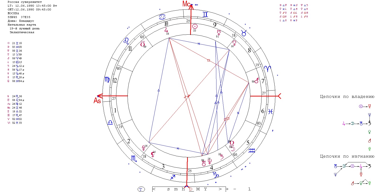 В российской карте (карте власти) видно сильные акценты Сатурна и Урана одновременно. С Сатурном ясно, аспект года - квадрат транзитного Сатурна к Солнцу, а заодно и к Сатурну карты, весьма серьезный аспект. Это может быть то самое время, когда власти приходится отвечать за невыполненные обязательства, за нарушения Закона и законов, которые написаны властью, скажем так, чуть более серьезной и немного в других кабинетах, чем представляется засидевшимся в своих креслах «властелинам реальности». И вероятность такого расклада особенно усиливается в это время на границе эпох и времен, на завершении одних и начале других больших космических циклов и эволюционных программ. А именно таковыми являются ближайшие годы, и годы 2019-2021 – именно эти пограничные годы. Это может быть время расплаты за ошибки, необходимости серьезной коррекции курса власти, перемен во власти, а с другой стороны, власть может становиться более жесткой, ограничивающей, подавляющей, проявляющей ограничительные функции Сатурна со своей стороны. В любом случае, период максимального влияния такого аспекта, как правило, бывает отмечен особым напряжением или даже особыми ситуациями в государстве. Во второй половине года проход Сатурна в квадрате с Солнцем захватывает август, сентябрь и октябрь. Причем в сентябре Сатурн стационарно зависает в орбисе 1 минуты от точного квадрата к Солнцу карты, что увеличивает напряженность данного транзита (Сатурн поворачивает на директное движение 18.09.2019). Точные аспекты Сатурна к Солнцу карты 12 и 23 сентября.