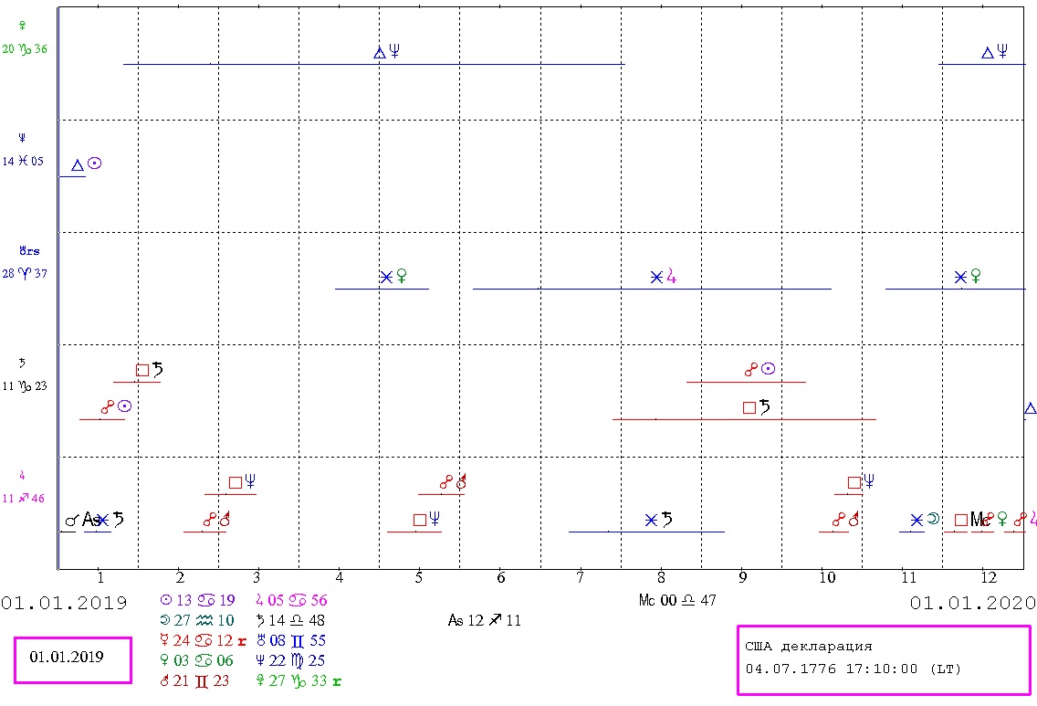 Затмения в карте США. Солнечное затмение 06.01.2019 было в оппозиции к Солнцу карты. Солнечное затмение 02.07.2019 в соединении с Солнцем карты. Это говорит о повышенной вероятности важных событий, в частности, связанных с курсом страны, с имиджем страны, с лидером, с властью, с переменами во власти. Другие затмения 2019 также затрагивают важные точки карты.