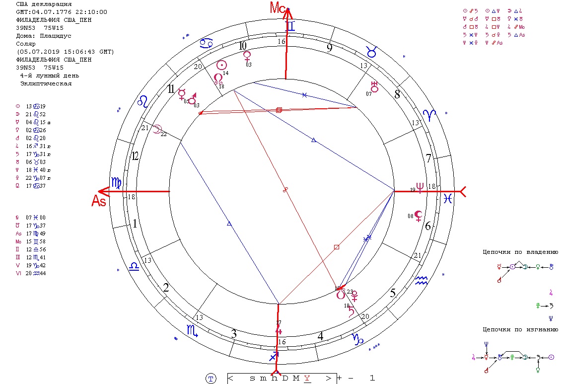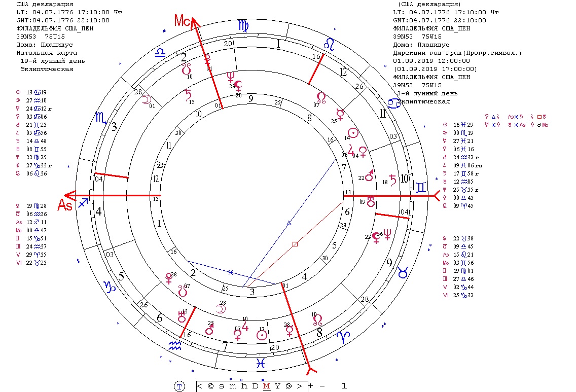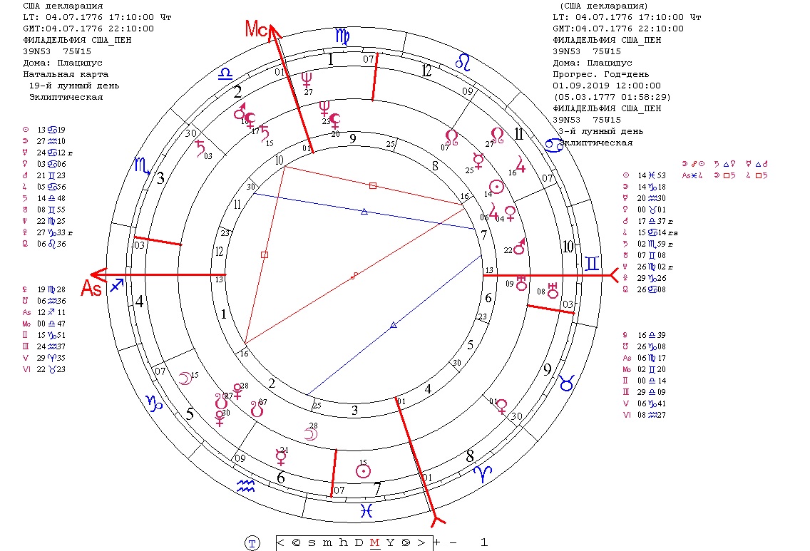 Трудно удержаться и не посмотреть на еще одну актуальную карту года США - на соляр 2019. Карта тоже яркая и с выраженными акцентами. Это подтверждает предположение о том, что солнечный год ожидается для США наполненным важными событиями.