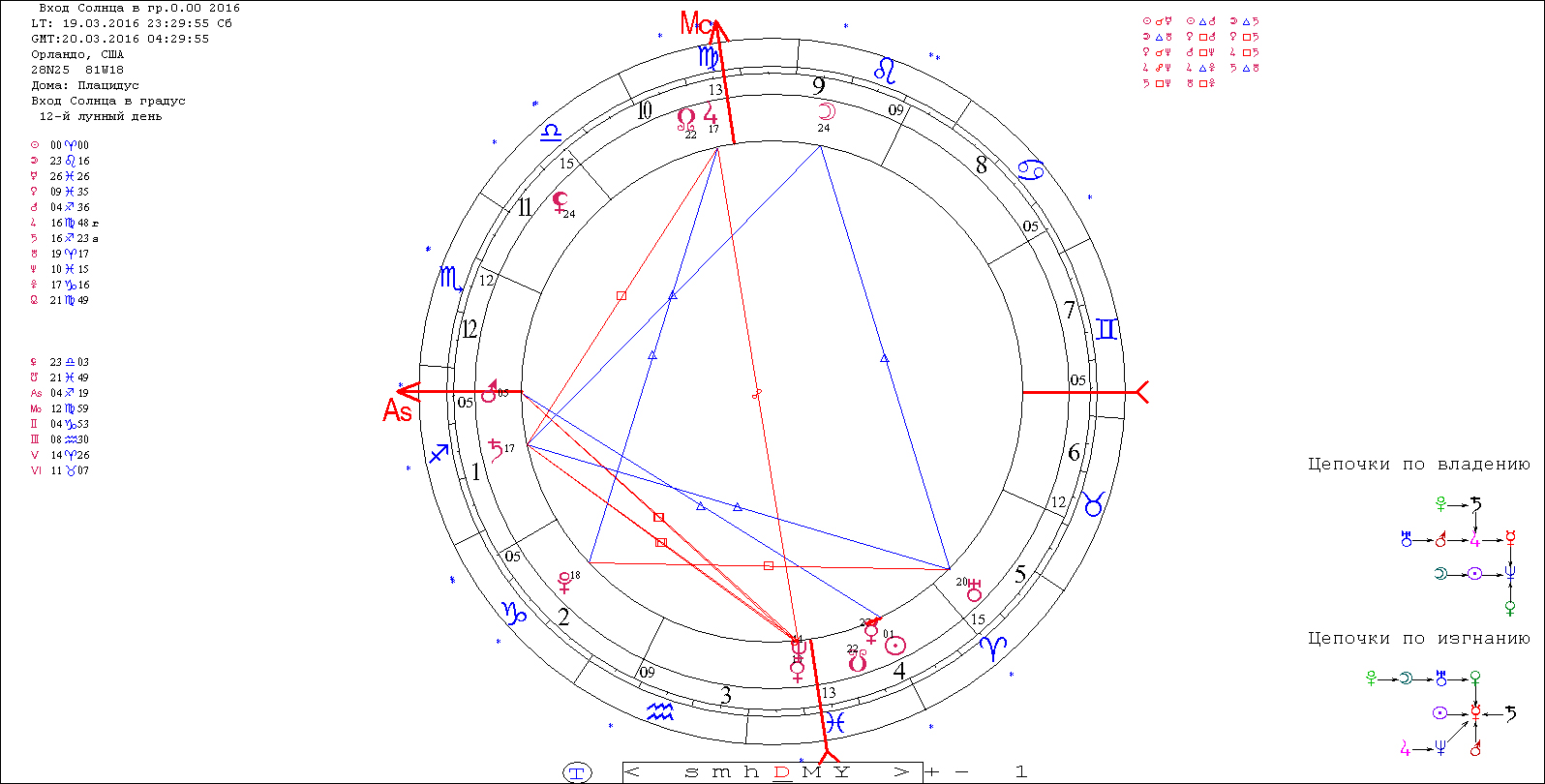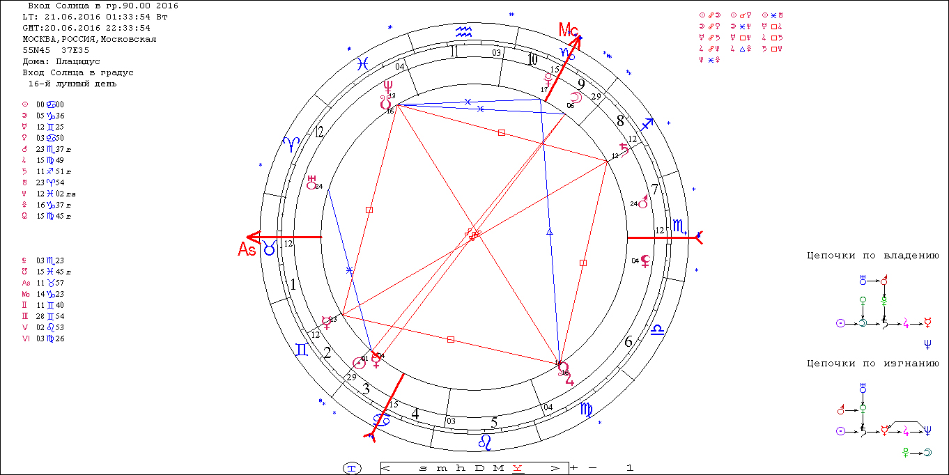 2016 прошел cвой Зенит, то бишь, летнее солнцестояние. Есть особый астрологический смысл в этом моменте, в моменте входа Солнца в знак Рака. Считается, что в карте входа Солнца в этот кардинальный знак Зодиака можно увидеть символическую программу как минимум следующих 3-х месяцев. Эту карту оставим без комментариев, пусть будет просто предметом дизайна.