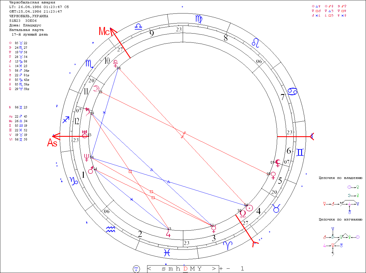 Как уже говорилось, оппозицию Антарес - Альдебаран некоторые астрологи не слишком дружелюбно называют осью катастроф, а Антарес катастрофической звездой. Определенным аргументом за эту версию может быть, в частности, Чернобыльская катастрофа 26.04.1986. Это было ровно один цикл Сатурна назад. Сатурн был в 9-ом градусе Стрельца в точном соединении (орбис меньше 1 градуса) с этой самой звездой Антарес. В карте момента чернобыльской аварии очень символично на Ас Уран – планета техногенных катастроф и революций в своем негативном варианте проявления. Кроме того, Уран – одна из планет, символически связанная с атомной энергией.