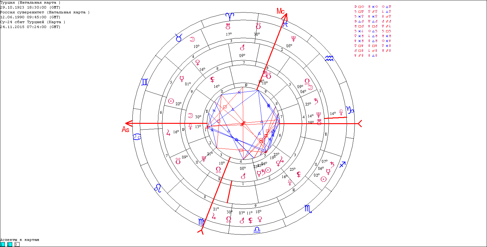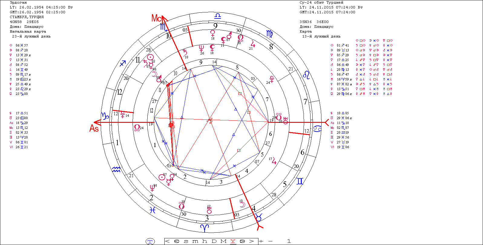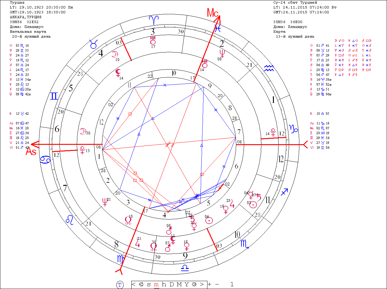 Это может означать, что военная операция России (включение энергетики Марса в карте России) в Сирии в непосредственной близости с Турецкой границей с астрологической точки зрения может рассматриваться Турцией как военные действия против нее (сразу же включается энергетика Марса карты Турции в период, когда конфликтное марсианское противостояние в картах доведено до предела). Или, по крайней мере, затрагивает военные интересы Турции, очень включая там конфликтную, воинственную энергетику. В реальности Турция, как известно, с начала войны в Сирии была противником Асада и поддерживала силы оппозиции, сражавшейся против него. Российские же войска выступили на стороне Асада. Плюс туркоманы, родственные туркам, проживающие в Сирии на границе с Турцией, которые воевали против Асада, и которым доставалось от ударов российской авиации.