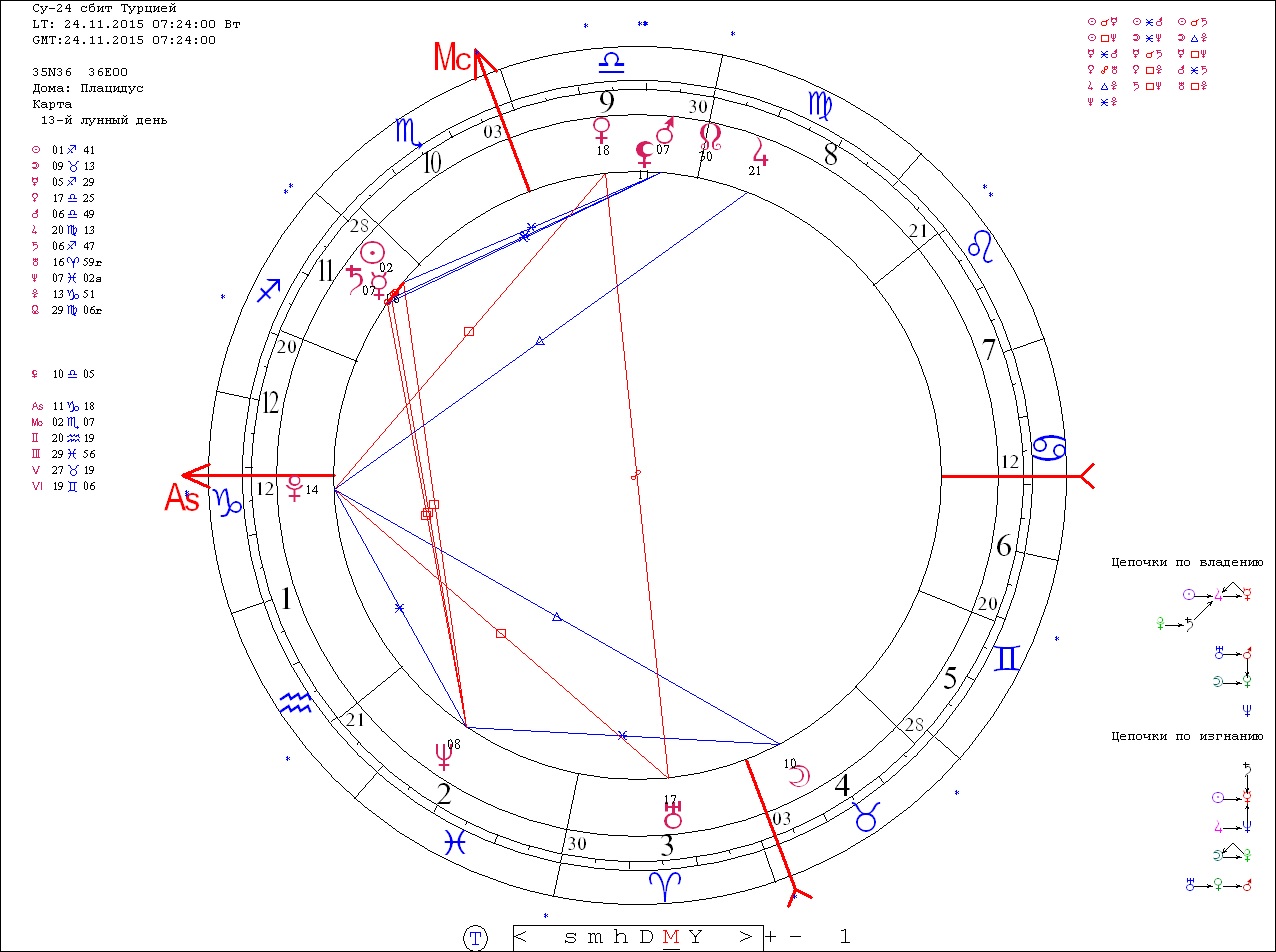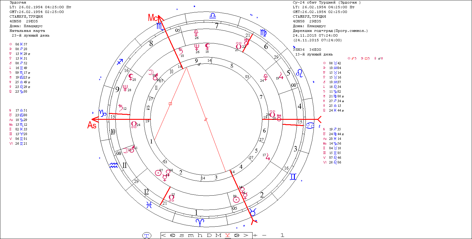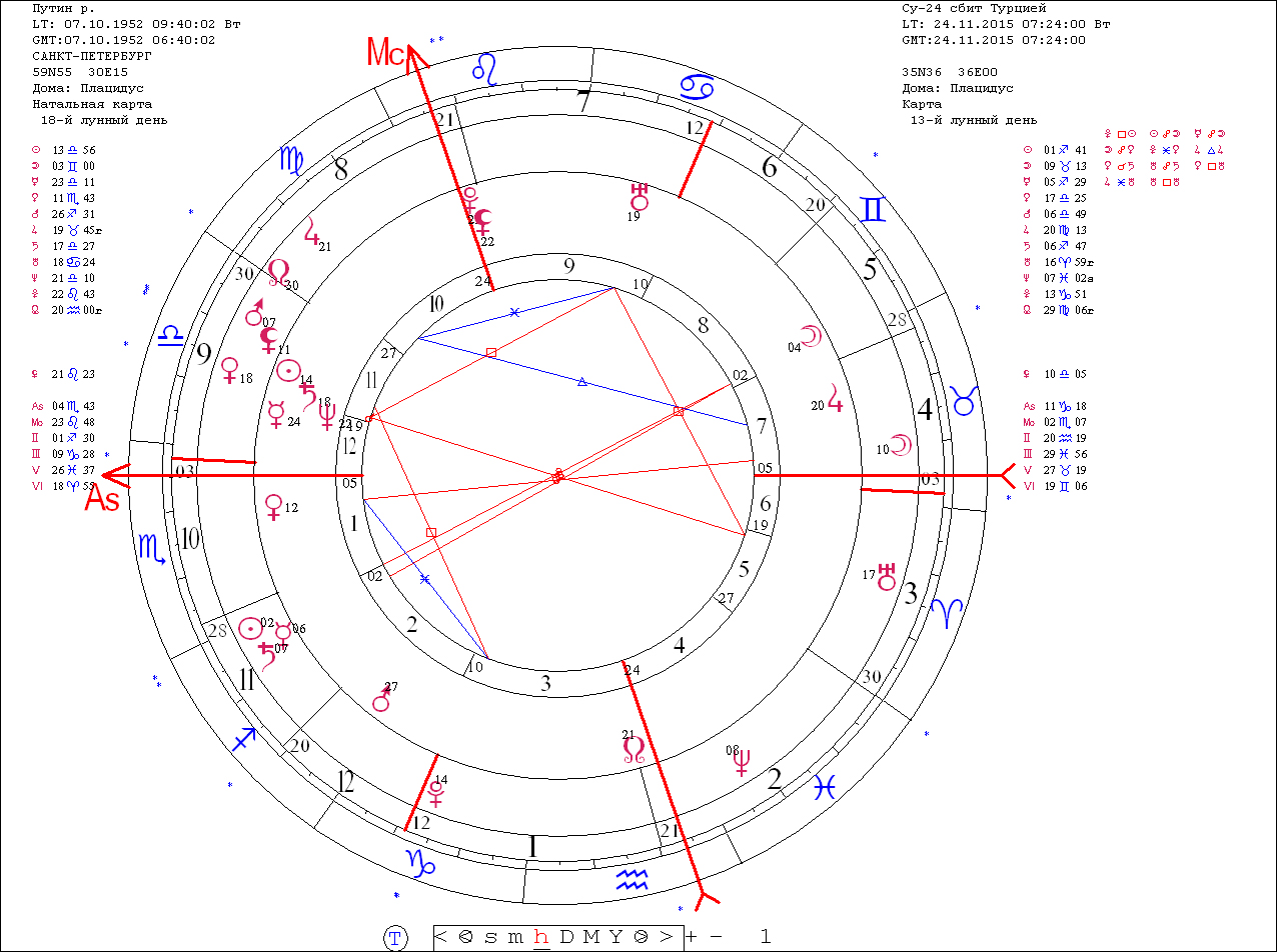 Это может означать, что военная операция России (включение энергетики Марса в карте России) в Сирии в непосредственной близости с Турецкой границей с астрологической точки зрения может рассматриваться Турцией как военные действия против нее (сразу же включается энергетика Марса карты Турции в период, когда конфликтное марсианское противостояние в картах доведено до предела). Или, по крайней мере, затрагивает военные интересы Турции, очень включая там конфликтную, воинственную энергетику. В реальности Турция, как известно, с начала войны в Сирии была противником Асада и поддерживала силы оппозиции, сражавшейся против него. Российские же войска выступили на стороне Асада. Плюс туркоманы, родственные туркам, проживающие в Сирии на границе с Турцией, которые воевали против Асада, и которым доставалось от ударов российской авиации.